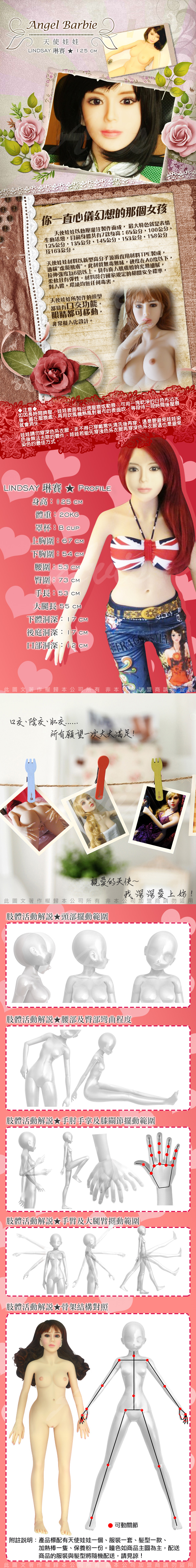.商品內容:現貨供應 天使娃娃 真人矽膠娃娃 1:1非充氣 帶骨骼真人版 陰交+肛交+口交 LINDSAY琳賽-125CM