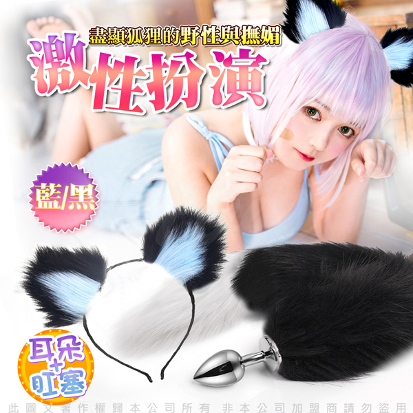 妖豔小狐狸角色扮演 毛絨耳朵+不鏽鋼肛塞尾巴 狐狸尾 黑藍