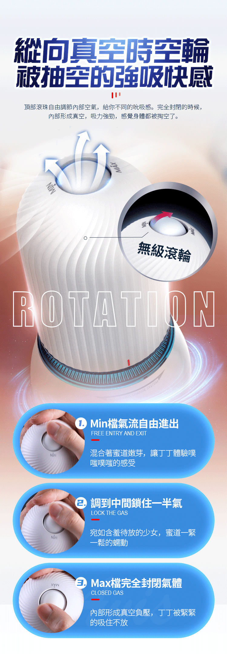 通過旋轉機身和頂部滾珠,調節蜜道的鬆緊度和吮吸力,宛如跨時空體驗她不同年紀的緊度。